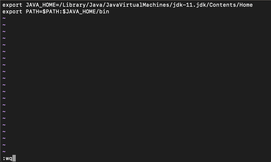 위 명령어를 입력하면 vi 에디터 화면이 나올텐데 아까 발견한 경로를 아래와 같이 넣어준다. 그리고 마지막에 esc 누른 다음 `:wq`를 눌러주어야 한다. 저장하고 종료한다는 의미로, 이것을 하지 않고 강제로 나가게 되면 저장이 안 될 것이다.