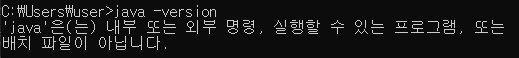 설치 되어 있다면 버전이 뜰 거고, 설치되어 있지 않다면 'java은(는) 내부 또는 외부 명령, 실행할 수 있는 프로그램, ...이 아닙니다.'라는 명령어가 뜰 것이다.